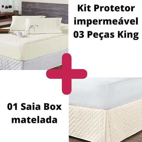Kit protetor colchão king + 2 capa de travesseiro impermeável + saia box palha O kit impermeável matelado é o um combo indispensável para sua cama. O protetor e o porta travesseiros impermeável irão proteger seu colchão e travesseiro de eventuais acidentes com bebidas, líquidos, sujeira em geral e também da transpiração noturna, o que poderá proporcionar maior vida útil para seu enxoval.