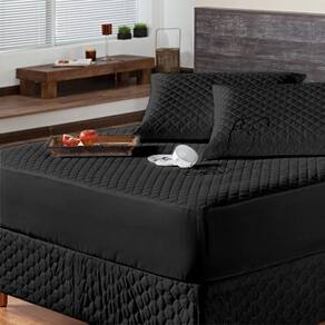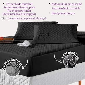Kit protetor colchão king + 2 capa de travesseiro impermeável + saia box preto O kit impermeável matelado é o um combo indispensável para sua cama. O protetor e o porta travesseiros impermeável irão proteger seu colchão e travesseiro de eventuais acidentes com bebidas, líquidos, sujeira em geral e também da transpiração noturna, o que poderá proporcionar maior vida útil para seu enxoval.