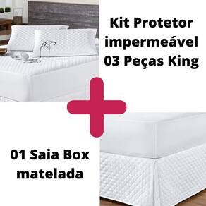 Kit protetor colchão king + 2 capa de travesseiro impermeável + saia box branco O kit impermeável matelado é o um combo indispensável para sua cama. O protetor e o porta travesseiros impermeável irão proteger seu colchão e travesseiro de eventuais acidentes com bebidas, líquidos, sujeira em geral e também da transpiração noturna, o que poderá proporcionar maior vida útil para seu enxoval.