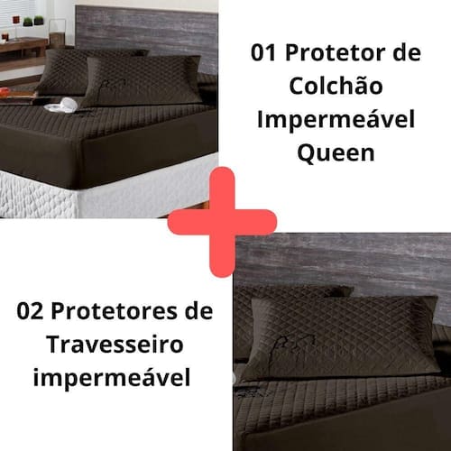 Kit Protetor Colchão Queen + 2 Capas de Travesseiro Impermeável Marrom O KIT IMPERMEÁVEL MATELADO é o um combo indispensável para sua cama. O protetor e o porta travesseiros impermeável irão proteger seu colchão e travesseiro de eventuais acidentes com bebidas, líquidos, sujeira em geral e também da transpiração noturna, o que poderá proporcionar maior vida útil para seu enxoval.