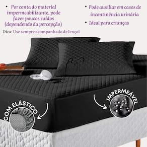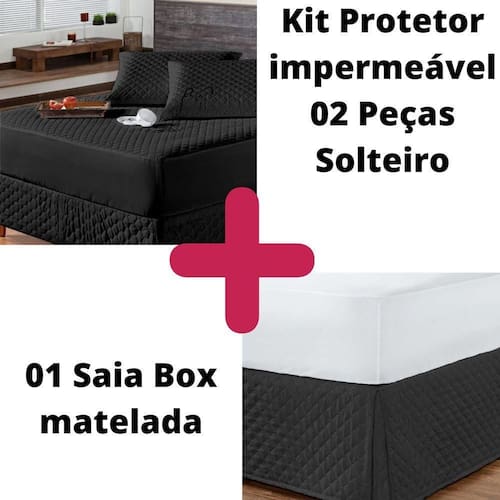 Kit protetor colchão solteiro + 1 capa de travesseiro impermeável + saia box preto O kit impermeável matelado é o um combo indispensável para sua cama. O protetor e o porta travesseiros impermeável irão proteger seu colchão e travesseiro de eventuais acidentes com bebidas, líquidos, sujeira em geral e também da transpiração noturna, o que poderá proporcionar maior vida útil para seu enxoval.