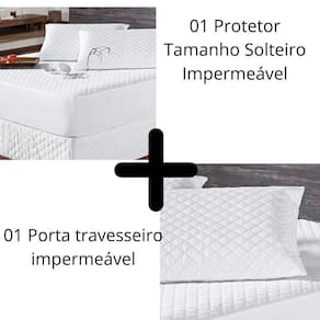 Kit Protetor Colchão Solteiro + Capa Travesseiro Impermeável O KIT IMPERMEÁVEL MATELADO é o um combo indispensável para sua cama.O protetor e o porta travesseiros impermeável irá proteger seu colchão e seu travesseiro de eventuais acidentes com bebidas, líquidos, sujeira em geral e também da transpiração noturna, o que poderá proporcionar maior vida útil para seu enxoval. CONTEÚDO DA EMBALAGEM- 01 Protetor de colchão SOLTEIRO: 1,88 m x 88 cm x 40 cm- 01 Porta Travesseiros: 70 cm x 50 cm COMPOSIÇÃO TEXTIL Protetor Colchão - Tecido Superior: 100% Poliéster- Tecido Interno Impermeável: 50% Polietileno / 50% Polipropileno- Enchimento: 100% Poliéster- Tecido Inferior: 100% Polipropileno COMPOSIÇÃO TEXTIL Protetor Travesseiro - Tecido: 100% Poliéster- Tecido Interno Impermeável: 50% Polietileno / 50% Polipropileno FICHA TÉCNICA- Quantidade de peças: 02- Cor: Branco- Bordado: Não- Fabricação: Matelado Ultrassônico sem linhas ORIENTAÇÕES PARA LAVAGEM- Processo manual lavar à mão ;- Não deixar o produto de molho, pois roupas de cama de cor forte podem desbotar;- Utilizar sabão neutro.- Evite sabão do tipo limpeza profunda e/ou tira manchas;- Lavar com temperatura máxima de 30C;- Secar em varal à sombra;- Não alvejar / não branquear;- Não secar em secador rotativo não utilizar secadora ;- Não lavar a seco;- Não passar;- Vapor pode causar danos irreversíveis. ATENÇÃO- Verificar as dimensões do produto antes da compra.- Siga as orientações para lavagem para aumentar a vida útil das peças- Foto ilustrativa.- Variação das cores pode ocorrer de acordo com a configuração do monitor.- Pode ocorrer variação na tonalidade do tecido de acordo com o lote da matéria-prima.- As peças decorativas não estão inclusas neste produto. Marca: Lux Enxovais