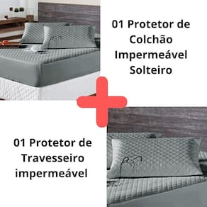 Kit Protetor Colchão Solteiro + Capa Travesseiro Impermeável Cinza O KIT IMPERMEÁVEL MATELADO é o um combo indispensável para sua cama. O protetor e o porta travesseiros impermeável irá proteger seu colchão e seu travesseiro de eventuais acidentes com bebidas, líquidos, sujeira em geral e também da transpiração noturna, o que poderá proporcionar maior vida útil para seu enxoval.