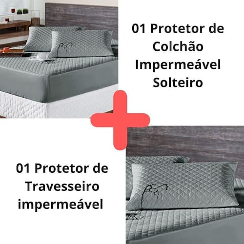 Kit Protetor Colchão Solteiro + Capa Travesseiro Impermeável Cinza O KIT IMPERMEÁVEL MATELADO é o um combo indispensável para sua cama. O protetor e o porta travesseiros impermeável irá proteger seu colchão e seu travesseiro de eventuais acidentes com bebidas, líquidos, sujeira em geral e também da transpiração noturna, o que poderá proporcionar maior vida útil para seu enxoval.