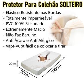 Kit protetor colchão solteiro impermeável lençol + fronha Neste kit conteúdo: 1 protetor casal com elastico cor bege. 1 fronha protetor de travesseiro O protetor para colchão siliconizado com elástico senior care, protege totalmente o colchão do suor, umidade e líquido, evita a proliferação de ácaros e fungos preservando o conforto e protegendo sua saúde. Ideal para incontinência urinária. Toque suave. Diferenciais: - não esquenta e não faz barulho; - antialérgico; - antiácaro; - lavável; - impermeável; - com elástico. Indicações - idosos; - bebes, crianças desfraude ; - pne's portadores de necessidades especiais; - incontinência urinária; - hotéis, pensões, casa de repouso, clínicas e hospitais. Tamanho: Lençol solteiro 90 l x 190 c x 20 a cm; Composição: confeccionado 100% em plástico pvc siliconizado com elástico, sistema vapt-vupt. Fronha 70cm x 52cm. Composição: 100% pvc siliconado. com zipper lateral facilitando a colocação. cor: bege. Conteúdo: 1 protetor solteiro com elastico cor bege. 1 fronha siliconada - o material é plástico Não, o material pela senior care na confecção do nosso modelo vapt vupt é o pvc siliconizado. - quando forrado por cima escorrega Depende muito do tecido, mas se for algodão não escorregará. - faz muito barulho Não, eles são confeccionados em pvc siliconizado além de dar um toque muito macio possibilita que o lençol seja extremamente silencioso. Marca: Não Informado Ean: 7896705500173