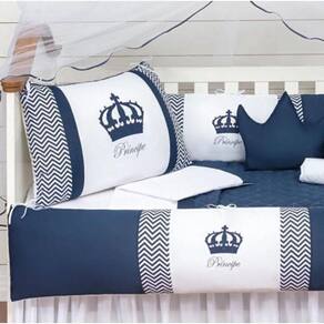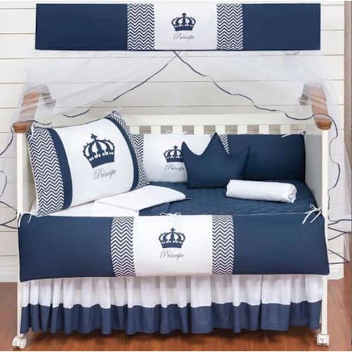 O Kit Protetor de Berço Coroa vem com 11 peças para preparar e decorar o bercinho do seu bebê com praticidade e beleza. As laterais e cabeceiras acompanham zíper para facilitar a lavagem do produto. Estampado com coroa de príncipe, o Kit proporciona ao quartinho com muito mais personalidade e conforto.Itens inclusos01 Cabeceira de 0.65 x 0.40 m02 Lateral de 1.25 x 0.25 m01 Lençol de cima de 1.30 x 0.70 m01 Fronha de 0.28 x 0.38 m01 Bando do mosquiteiro de 1.40 x 0.20 m01 Mosquiteiro de 4.50 x 1.50 m01 Edredom de 1.30 x 0.75 m01 Almofada Coroa de 0.40 x 0.25 m01 Trocador de 0,60 x 0,40 m01 Saia box de 1,30 x 0,70 x 0,30 mEspecificações técnicasMarca: Beatriz EnxovaisModelo: Kit Protetor de Berço CoroaCor: Azul MarinhoQuantidade peças: 11Composição tecido estampado: 100% algodãoComposição tecido liso: 50% Algodão / 50% PoliésterEnchimento: 100% PoliésterMosquiteiro: 100% PoliamidaObs.: O produto já vai pronto para o uso, com o enchimento já incluso. Acompanha as peças conforme a descrição, não esta incluso o berço. Marca: L2m