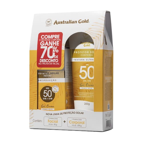 Kit com protetores solares para todos os tipos de pele, corpo e rosto. Australian Gold Proteção FPS 50 bloqueia os raios nocivos do sol, além de ação antipoluição e antienvelhecimento precoce no corpo todo.