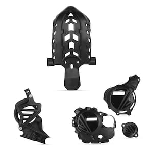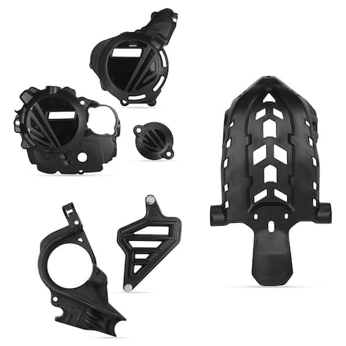 Itens inclusos: 1 - Protetor de motor. 1 - Par de protetores de tampas. 1 - Protetor da tampa do filtro de óleo. 1 - Anti block. 1 - Protetor de pinhão. 5 - Parafusos. 5 - Arruelas. 11 - Buchas.