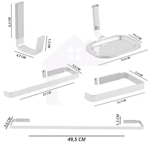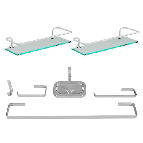 Fixação: parafusos e buchas Composição do kit: 01 porta toalha de banho, 01 porta toalha de rosto, 01 saboneteira, 01 papeleira 01 cabide duplo 01 porta shampoo canto vidro 01 torneira cod 1065