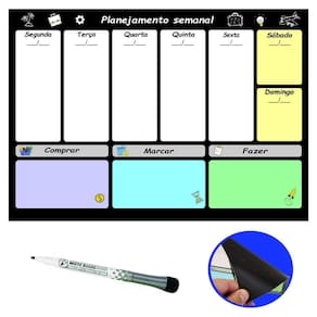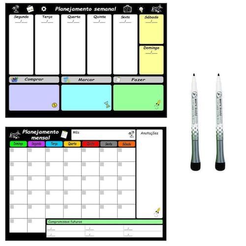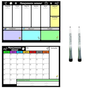 Kit Quadro Planejamento Mensal e Semanal Magnético Geladeira Kit com dois quadros magnéticos para marcação de compromissos, sendo um semanal e um mensal. O quadro de planejamento mensal é uma ferramenta prática para marcação de compromissos ao longo do mês e até de meses seguintes, pois possui espaço extra para isto. Já, o quadro semanal, é muito útil para programar as atividades mais imediatas da semana que começa. Estes quadros são especialmente úteis quando colocados na geladeira, um local de fácil acesso e visibilidade na maioria das casas. Ele ajuda a organizar os compromissos, eventos e tarefas importantes de maneira visual e intuitiva. A parte de trás de cada quadro é totalmente coberta por manta de imã super aderente. Juntamente, são enviadas duas canetas preta de ponta fina com borracha tipo espuma na ponta. Ela também possui um imã em seu corpo, o que permite sua fixação na geladeira. caso a tinta acabe, esta caneta pode ser facilmente encontrada em qualquer papelaria.