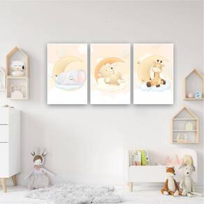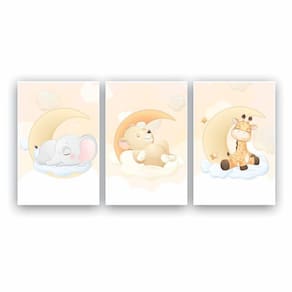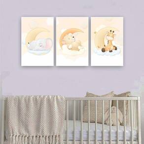 Kit Quadros 3Pçs Infantil Safari Elefante, Leão E Girafa