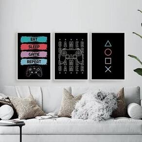 Kit 3 quadros eat sleep game repeat 33x24cm Moldura: madeira preta Informações do produto tire todas as suas dúvidas no descritivo abaixo: decoração para quarto, sala, cozinha, escritório, área gourmet e muito mais. Chega de paredes vazias medidas - cada peça tem 33x24cm a4 . Material do papel - papel fotográfico brilhante de altíssima resolução acabamento - todos os quadros são acompanhados de uma película de acetato para proteção da imagem. - os quadros são embalados de forma segura com plástico bolha com camada dupla de acordo com o tamanho dos quadros. Garantia - garantia de 3 meses. Meu quadro chegou. Como posso fixá-lo Você precisa apenas de um martelo e um prego, pois os quadros já vão acompanhados de penduradores. Esta é a forma mais indicada. Caso prefira, você pode utilizar uma fita dupla face neste caso, sugerimos de alta qualidade para evitar que descole e seu quadro caia . Como posso limpar meu quadro A limpeza é feita como um móvel comum da sua casa. Apenas um pano seco ou espanador são suficientes para tal