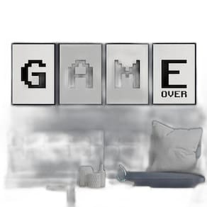 Kit 4 quadros game over preto e branco 33x24cm - com vidro Moldura: madeira preta Informações do produto tire todas as suas dúvidas no descritivo abaixo: decoração para quarto, sala, cozinha, escritório, área gourmet e muito mais. Chega de paredes vazias medidas - cada peça tem 33x24cm a4 . Material do papel - papel fotográfico brilhante de altíssima resolução acabamento - todos os quadros são acompanhados de vidro para proteção da imagem. - moldura em madeira maciça na cor preta e pendurador . - os quadros são embalados de forma segura com plástico bolha com camada dupla de acordo com o tamanho dos quadros. Você precisa apenas de um martelo e um prego, pois os quadros já vão acompanhados de penduradores. Esta é a forma mais indicada. Como posso limpar meu quadro A limpeza é feita como um móvel comum da sua casa. Apenas um pano seco ou espanador são suficientes para tal