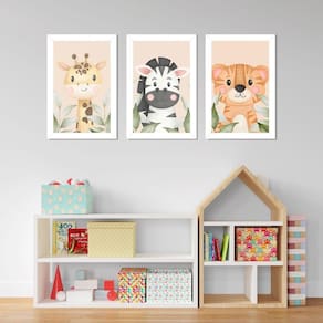 Kit 3 Quadros Safari Aquarela Infantil Quarto Vidro 20x30cm