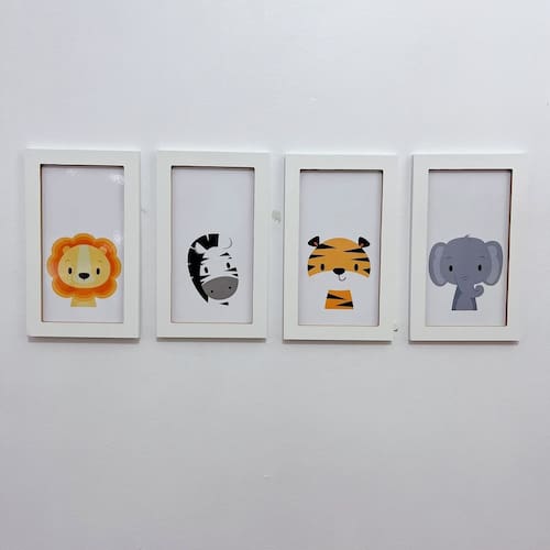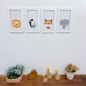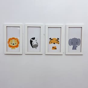 Kit composto por 4 quadros tema Safari com fundo branco.