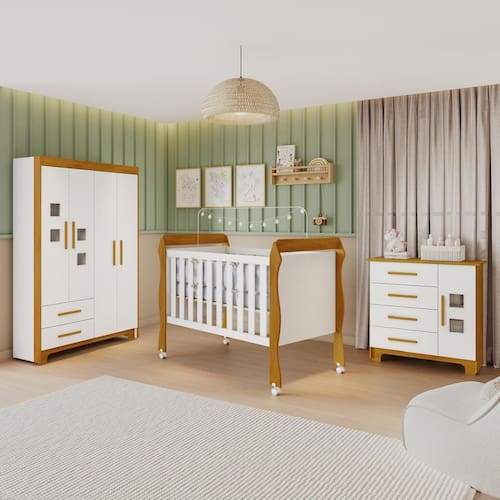 Transforme o ambiente do seu bebê com o Kit Quarto Completo Soninho, que une elegância, funcionalidade e segurança em um design moderno com acabamento branco e amadeirado. Ideal para famílias que buscam praticidade e um espaço acolhedor, o conjunto é composto por berço minicama, cômoda, guarda-roupa e colchão, oferecendo tudo o que você precisa para montar um quarto completo.