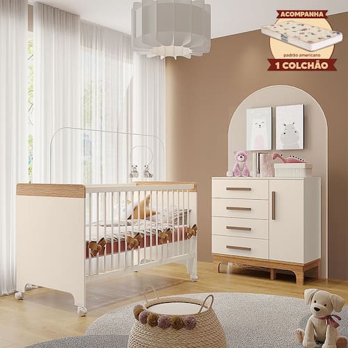 Crie um ambiente seguro, organizado e cheio de estilo para o bebê com o Kit Quarto Infantil Doçura. Além do berço e da cômoda, esta versão inclui um colchão padrão americano (130x70x10 cm), proporcionando mais conforto e proteção ao bebê: