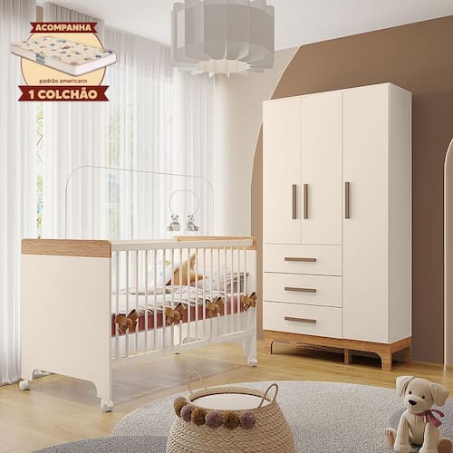 Transforme o quarto do bebê com o Kit Quarto Infantil Doçura, que une praticidade, design moderno e segurança. Além do berço e guarda-roupas, esta versão acompanha um colchão padrão americano (130x70x10 cm), ideal para garantir conforto e proteção ao bebê:
