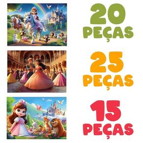 Kit Quebra Cabeça Princesas 15/ 20 E 25 Peças +4 Anos 3 Unidades Big Star O Kit Quebra-Cabeças Princesas é uma opção divertida e educativa para crianças a partir de 4 anos. Composto por três quebra-cabeças de 15, 20 e 25 peças, este conjunto oferece níveis crescentes de desafio, estimulando o raciocínio lógico, a concentração e a coordenação motora dos pequenos. Cada quebra-cabeça apresenta ilustrações encantadoras das princesas favoritas, com cores vibrantes e detalhes que despertam a imaginação das crianças.