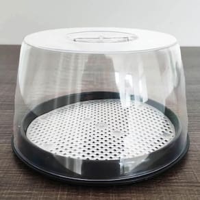 Dimensão bandeja: 17,5cm (C) x 17,5cm (L) x 2,5cm (A);