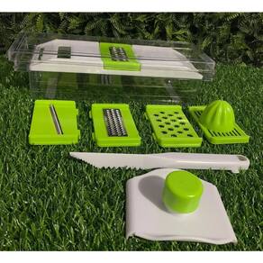 O ralador de legumes de plástico é um utensílio de cozinha feito e projetado para ralar ou fatiar legumes e outros alimentos. Ele possui 8 peças entre lâminas, raladores, triturador e espremedor. Com ele você pode ter diferentes tamanhos e formas de ralados ou fatiados.