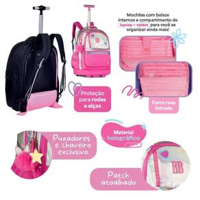 Um conjunto sofisticado e funcional para acompanhar a rotina escolar. A mochila RB27016, em PVC holográfico, traz design único com bordado de estrela, patches frontais, divisória para notebook e tablet, dois compartimentos frontais, bolsos laterais e chaveiro triplo exclusivo, além da cartela de adesivos Rebecca Bonbon. Pode ser Utilizado no carrinho ou como mochila de costas, com proteção para rodinhas e alças acolchoadas. Dimensões aproximadas: 48x35x19cm. A lancheira RB27018, também em PVC holográfico, é prática e versátil, com amplo espaço interno, revestimento térmico, bolso frontal extra e três opções de uso: alça de mão, alça de ombro ou alça carona para acoplar na mochila. Dimensões aproximadas: 20x24x14cm. O estojo RB27019 completa o kit com organização total: possui 36 elásticos internos, compartimento extra com fechamento em zíper e capacidade para até 100 lápis ou canetas. Dimensões aproximadas: 22x14x6cm. Um kit completo, cheio de charme holográfico e praticidade para o dia a dia.