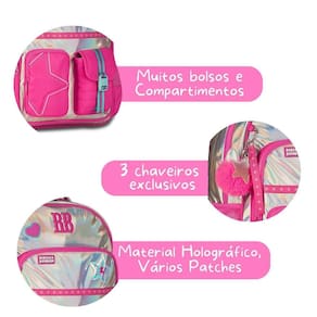 A Mochila Rebecca Bonbon RB27020 é o grande destaque deste kit. Confeccionada em PVC holográfico de alta resistência, apresenta um brilho único que reflete diferentes tons de acordo com a luz, tornando-a um verdadeiro acessório fashion. O compartimento principal é espaçoso e conta com divisórias exclusivas para notebook e tablet, garantindo praticidade e segurança para os eletrônicos. Na parte frontal, possui dois bolsos funcionais - um com zíper e outro com fechamento magnético - além de um compartimento extra com divisórias internas, perfeito para manter os materiais sempre organizados. Os bolsos laterais telados são ideais para garrafinhas, e o bolso antifurto traseiro traz ainda mais segurança. Detalhes como os patches emborrachados e atoalhados, o logo RB metalizado, o chaveiro triplo com pompom de orelhinhas e os puxadores personalizados tornam essa mochila um item exclusivo e sofisticado. O conforto também está garantido graças às alças acolchoadas e ajustáveis, à alça de mão reforçada e à alça carona para acoplar na mala de viagem. A Lancheira Rebecca Bonbon RB27018 segue o mesmo design holográfico da coleção, garantindo um visual totalmente coordenado. Espaçosa e funcional, possui revestimento térmico interno que mantém os alimentos frescos por mais tempo, além de um bolso frontal prático para pequenos itens. Com três opções de uso - alça de mão, alça tiracolo regulável e alça carona para acoplar na mochila ou mala - oferece toda a versatilidade que as meninas precisam no dia a dia. Completando o kit, o Estojo Box Rebecca Bonbon RB27019 é a escolha perfeita para quem ama organização. Comporta até 36 lápis em elásticos individuais e ainda possui um estojo interno separado com fechamento por zíper. Dimensões aproximadas: Mochila: 44x33x14cm Lancheira: 20x24x14cm e Estojo; 22x14x06cm Esse kit completo é muito mais do que materiais escolares: é um conjunto premium que transmite estilo, praticidade e identidade. A linha Rebecca Bonbon foi pensada para meninas que desejam expressar sua personalidade e carregar consigo um acessório que vai além da sala de aula, acompanhando também momentos de lazer, viagens e passeios. Marca: Não Informado