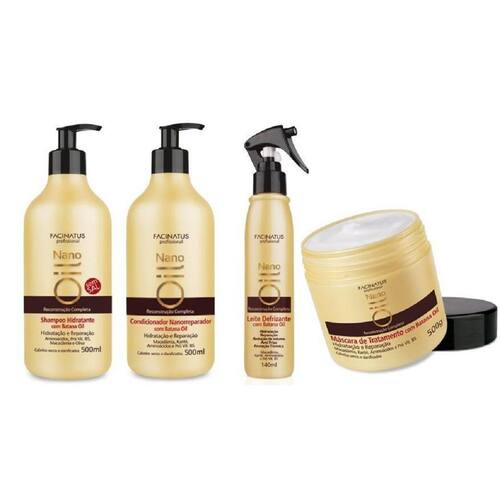 Kit Nano Oil Reconstrução Completa Facinatus Cosméticos com Batana Oil O Kit Nano Oil é um tratamento inteligente com nanotecnologia, que possui partículas microscópicas de Batana Oil que penetram melhor na fibra capilar reparando os danos mais profundos. São potencializados com aminoácidos, pró-vitamina B5, óleo de macadâmia, óleo de oliva e manteiga de karité, esses ativos em conjunto agem tratando todo o complexo capilar.Fórmula com textura leve que promove a reconstrução completa dos fios, reduz o volume, elimina o frizz e age profundamente nos fios, promovendo hidratação e reparação diferenciadas. Deixando seus cabelos hidratados e radiantes a semana todaNanorreparação da raiz ás pontas.Indicado para cabelos secos e danificados. Seu pedido contém: 1 Shampoo Hidratante 500 ml1 Condicionador Nanorreparador 500ml1 Máscara de Tratamento 500 g1 Leite Defrizante 130 ml Marca: Facinatus Cosméticos