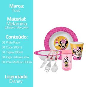 Kit Refeição Infantil Minnie Disney 7 Peças Prato, Tigela, Copo e Talheres - Tuut