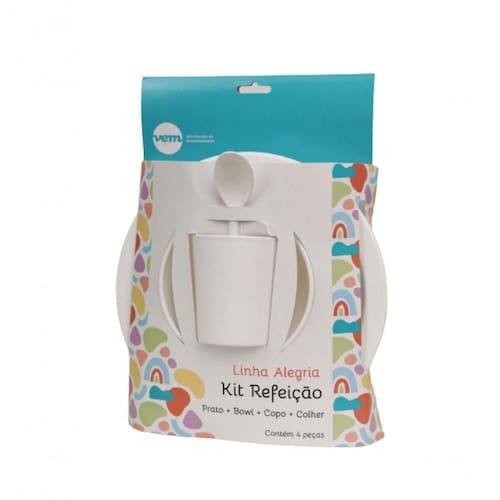 Kit Refeição Infantil Vem Branco Linha Alegria Kit Refeição Infantil VEM com 4 peças, com ele a hora da refeição vai ser um momento mais divertido. Com prato, tigela, colher e copo de alta qualidade, irá proporcionar uma refeição segura e mais alegre para o seu filho, afinal esses momentos precisam ser leves e descontraídos. Todos os produtos da Linha Alegria, são seguros, livre de BPA e ftalatos. Produto 100% atóxico, atendendo aos padrões de segurança e testes de saúde da ANVISA no Brasil e FDA dos EUA. O produto é flexível e não deforma, estável, durável, anti-queda, resistente e 100% reciclável. Pode ser levado ao micro-ondas ou freezer. RECOMENDAÇÕES DE USO E LIMPEZA:Não use utensílios de cozinha em metal ou quaisquer objetos afiados que possam riscar o produto. Use somente os objetos apropriados, como as espátulas e colheres de silicone da VEM, que não irão riscar o produto.Lave em água com detergente neutro e enxágue bem ou lave na parte superior máquina de lavar louça;Se os alimentos grudarem, deixe os recipientes cheios com água quente e com detergente neutro;Não utilize esfregões ou esponjas de aço de limpeza, nem detergentes abrasivos, dado que estes irão danificar os recipientes.Especificações Linha do Produto: AlegriaO KIT CONTÉM: 1 Prato 22cm x 1,8cm (diâm. x alt.) 1 Tigela 16,5cm x 3,7cm (diâm. x alt.) 300ml 1 Copo 200ml (7 cm altura) Cor: BrancoMaterial: Polipropileno