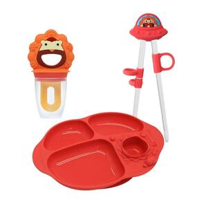 Prático, divertido e funcional, este kit traz o personagem Leão Marcus em vermelho vibrante para deixar as refeições mais alegres e confortáveis. Ideal para estimular a autonomia infantil, o conjunto foi pensado para atender diferentes etapas da alimentação, oferecendo utensílios seguros e ergonômicos.