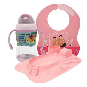 Especificações técnicas: Babador em silicone macio com fechamento ajustável Prato fabricado em plástico seguro e antiderrapante Copo em Tritan com válvula anti-vazamento Capacidade do copo: 240 ml Idade recomendada: a partir de 6 meses