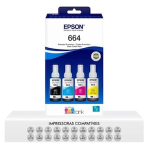 Kit de Refil de Tinta Original EPSON T664 (Preto, Ciano, Amarelo, Magenta) para impressoras Ecotank. Imprime milhares de páginas com alta qualidade e economia.Conexões