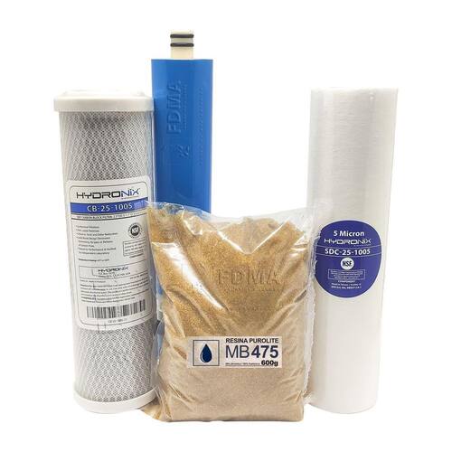 Kit de Refil Hydronix com alta durabilidade e resina mista purolite , para filtros deionizadores e osmose reversa. Refis certificados pela NSF, a maior certificadora internacional de qualidade de água, Hydronix uma das melhores marcas de refil do mundo. Filtro de sedimentos em polipropileno de 5 micras para remoção de sujeira e partículas microscópicas suspensas na água Carvão Block fabricado de casca de coco livre de fosfatos e de alta pureza. Alta redução de cloro, grande capacidade de retenção de sujeira e remoção de água amarelada, mau cheiro, cloro e cloramina, além da durabilidade muito maior comparado a outros refis de carvão. Resina Mista Purolite MB 475 50% Aniônica 50% Catiônia - Faz de 600 a 1000 Litros dependendo da condutividade da água de entrada Membrana de Osmose Reversa 100gpd, para remoção de partículas de tamanho molecular, como íons e bactérias. Este kit contém: - 1x Carvão Block Hydronix 10x2,5 - 5 Micras Durabilidade 6 meses ou 1 ano dependendo da quantidade água produzida realizar testes de cloro para avaliar se já é hora de trocar o refil - 1x Polipropileno Hydronix 10x2,5 - 5 Micras 3 meses ou quando estiver extremamente sujo - 1x Resina Mista Purolite MB 475 - 600g - 1x Membrana de Osmose Reversa 100gpd 380 Litros Diários Durablidade 18 meses ou 5mil Litros
