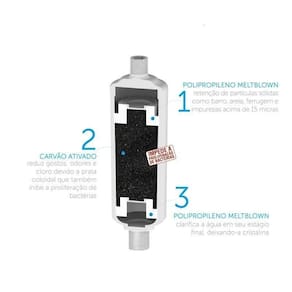 Refil 100% nacional, possui selo e qualificação do inmetro. Kit com 2 unidades de refil. Fácil instalação. Retém barro, areia e ferrugem. Bacteriostático. 1 refil equivale a 200 galões de água. Carvão ativado excelente redução de cloro.Tipo