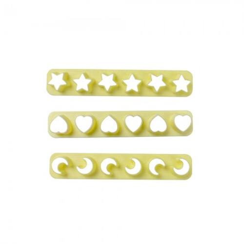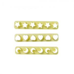 Kit régua miniaturas 1 (aproximadamente 1cm cada cavidade). Kit de três réguas com desenhos diferentes: coração, lua e estrela, cada uma corta seis figuras de uma só vez. Faça lindos apliques para seus doces, bolos, tortas, lembrancinhas e decorações, surpreenda seus clientes e eleve o nível de seus trabalhos com o corte preciso e acabamento profissional que esses cortadores atribuem.