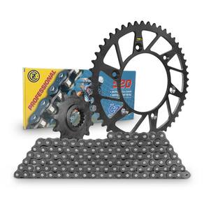 Especificações técnicas: Peso do kit: 2,899kg. Dentes da coroa: 50. Dentes do pinhão: 13. Elos da corrente: 118. Passe da corrente: 520h.