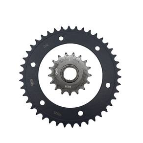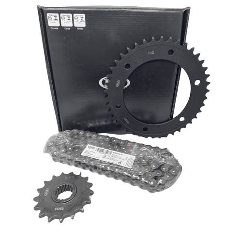 Embalagem: 01 Kit Transmissão Completo. ( Coroa, Pinhão e Corrente )