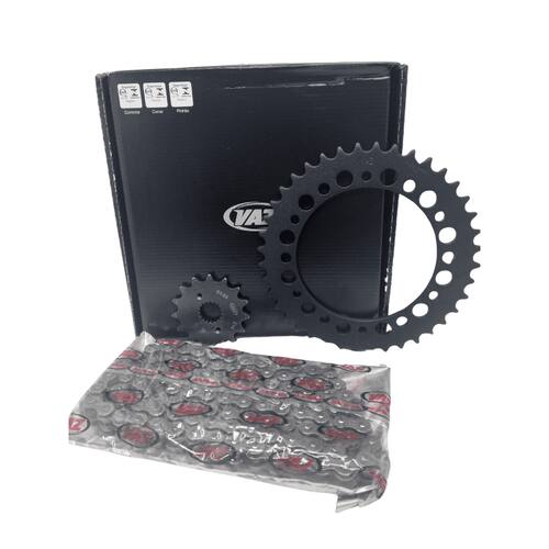 Embalagem: 01 Kit Transmissão Completo. ( Coroa, Pinhão e Corrente )