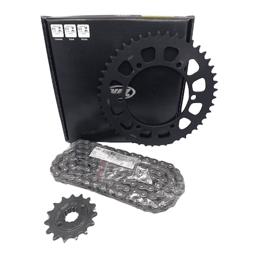 Embalagem: 01 Kit Transmissão Completo. ( Coroa, Pinhão e Corrente )