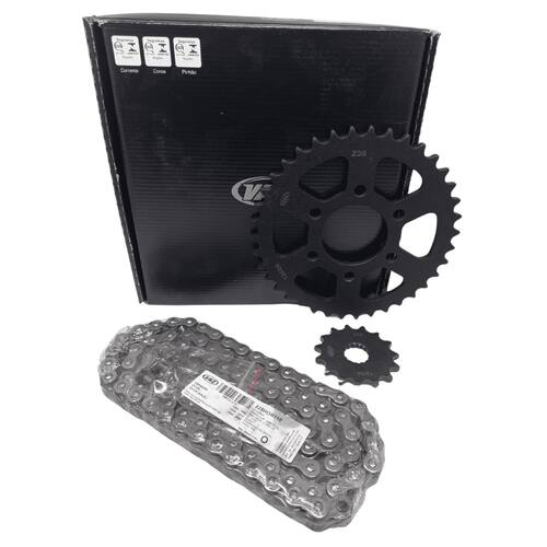 Embalagem: 01 Kit Transmissão Completo. ( Coroa, Pinhão e Corrente )