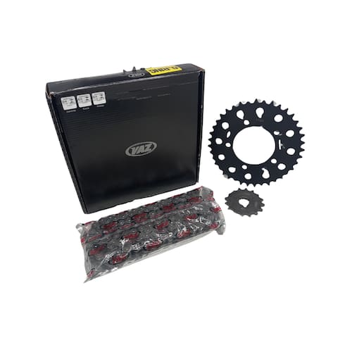 Embalagem: 01 Kit Transmissão Completo. ( Coroa, Pinhão e Corrente )