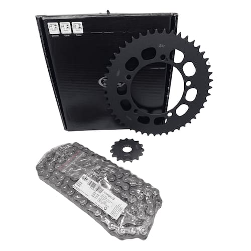 Embalagem: 01 Kit Transmissão Completo. ( Coroa, Pinhão e Corrente )