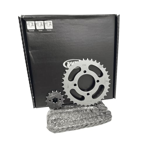 Embalagem: 01 Kit Transmissão Completo. ( Coroa, Pinhão e Corrente )