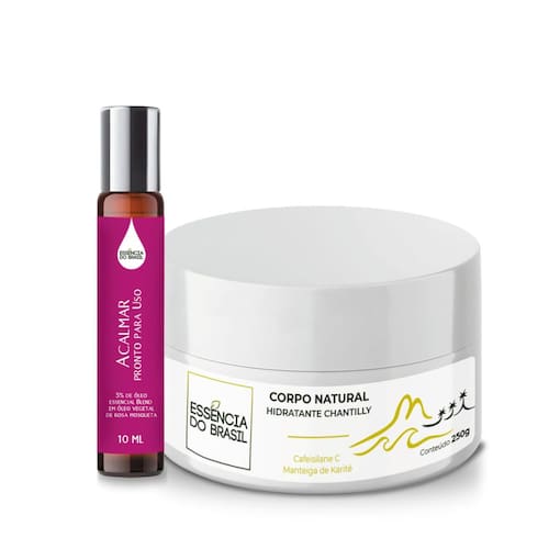 Kit Relaxamento: Hidratante Chantilly + Óleo Acalmar proporcione Conforto e Tranquilidade à Sua Pele e Mente Este kit proporciona conforto e tranquilidade ao longo do dia. O Hidratante Chantilly mantém a pele hidratada e suave, enquanto o óleo essencial pronto para uso roll-on de Acalmar ajuda a aliviar tensões e promove uma sensação de paz e serenidade. Hidratação Intensa com Hidratante Chantilly O Hidratante Chantilly é formulado com Cafeisilane C e de karité para proporcionar hidratação intensa, suavizando a pele e melhorando sua elasticidade. Ideal para manter a pele macia e nutrida durante todo o dia. e Relaxante com Óleo Essencial de Acalmar O Óleo Essencial Pronto para Uso Roll-on de Acalmar é uma mistura especialmente formulada para aliviar o e a ansiedade, ideal para uso durante o dia. Suas propriedades calmantes promovem uma sensação de paz e serenidade, ajudando você a enfrentar os desafios com tranquilidade. Rosa Mosqueta: Rico em ácidos graxos essenciais e vitaminas, o óleo de Rosa Mosqueta é altamente eficaz na regeneração da pele, auxiliando na redução de cicatrizes, manchas e sinais de envelhecimento. Óleo Essencial 5% em Óleo Vegetal de Rosa Mosqueta 10ml Roll-On Pronto para Uso: - Composição: 5% de óleo essencial em óleo vegetal de Rosa Mosqueta - Descrição: Pronto para uso direto na pele, este roll-on é uma combinação perfeita dos benefícios do óleo essencial com as propriedades regeneradoras do óleo de Rosa Mosqueta. Ideal para aplicação em áreas específicas, promovendo hidratação e regeneração cutânea, além de proporcionar uma sensação de relaxamento imediato. Experiência de Unboxing Exclusiva Cada produto do kit é embalado cuidadosamente ao som de melodias clássicas. Essa experiência de unboxing única transforma o momento de receber seu kit em uma experiência sensorial inesquecível. Detalhes da Embalagem: - Hidratante Chantilly 250g - Óleo Essencial Roll-on 10ml Praticidade e Conveniência com Vidro Roll-on O vidro roll-on é prático e ideal para aplicação direta, facilitando o uso do óleo essencial pronto para uso em pontos estratégicos do corpo, como pulsos e têmporas. Sua embalagem compacta permite levá-lo para qualquer lugar, garantindo relaxamento e bem-estar sempre que você precisar. Uso Responsável: Instruções Essenciais para seu Kit Para a segurança ao usar nosso kit, lembre-se de nunca ingerir e de seguir as instruções de uso do óleo essencial pronto para uso roll-on. Proteja sua saúde e bem-estar com esses cuidados. Encontre Seu Conforto e Tranquilidade com Elegância Invista no cuidado da sua pele e no seu bem-estar emocional com o nosso Kit Relaxamento. Experimente a hidratação e o alívio que sua pele e sua mente merecem a cada uso.