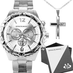 Kit Relógio Analógico Masculino Spaceman com Pulseira em Aço Inox com Colar com Oração do Pai Nosso Prateado