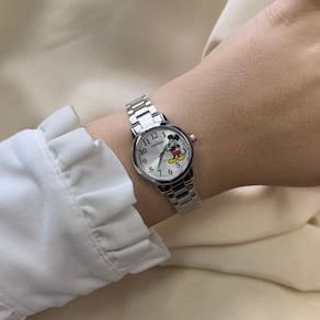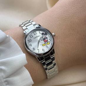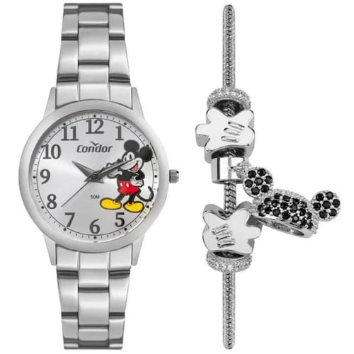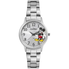 Seu mostrador com estampa do Mickey traz charme e originalidade, enquanto o acabamento em banho de prata proporciona um visual moderno e elegante. A caixa e a pulseira em aço inoxidável garantem durabilidade e conforto, tornando o relógio ideal tanto para o uso cotidiano quanto para ocasiões especiais.