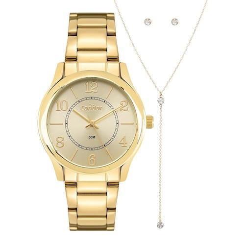Kit Relógio Condor Feminino Dourado com Colar e Brincos - 35,5mm O Kit Condor CO2035NRD/K4X é a combinação perfeita entre elegância e delicadeza, pensado para mulheres que apreciam acessórios versáteis e sofisticados para o dia a dia. Com design moderno e acabamento refinado, é ideal para presentear ou se presentear. O relógio possui caixa de 35,5 mm em metal dourado e pulseira em aço dourado, com mostrador clean em tom champanhe. Os marcadores de hora em algarismos dourados proporcionam excelente legibilidade e um toque de classe ao visual. O conjunto é acompanhado por um colar delicado com ponto de luz e pingente alongado, além de um par de brincos sutis e brilhantes, compondo um kit completo e harmonioso para diversas ocasiões. Além do visual encantador, o relógio tem resistência à água de 50 metros, garantindo praticidade para o uso cotidiano. Especificações Técnicas: Marca: Condor Modelo: CO2035NRD/K4X Gênero: Feminino Tamanho da Caixa: 35,5 mm Material da Caixa: Metal Material da Pulseira: Aço Cor da Caixa: Dourado Cor da Pulseira: Dourado Cor do Mostrador: Champanhe Tipo de Vidro: Cristal Mineral Resistência à Água: 5 ATM (50 metros) Mecanismo: Analógico Alimentação: Bateria Conteúdo da Embalagem: 1 Relógio Condor Feminino 1 Colar 1 Par de brincos Estojo exclusivo Manual de instruções Certificado de garantia Garantia: 1 ano contra defeitos de fabricação (fornecida pelo fabricante)