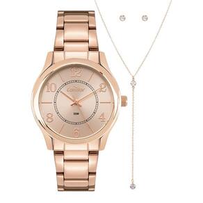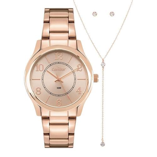 Kit Relógio Condor Feminino Rosé com Colar e Brincos - 35,5mm O Kit Condor CO2035NRF/K4J é a combinação perfeita de elegância e delicadeza para mulheres que apreciam acessórios sofisticados no dia a dia. Com um visual moderno e acabamento em tom rosé, este conjunto valoriza qualquer look com um toque de charme. O relógio possui caixa de 35,5 mm em metal e pulseira em aço rosé, com mostrador em tom rosado claro e números grandes, proporcionando leitura fácil e um visual harmonioso. É a escolha ideal para quem deseja praticidade com muito estilo. Acompanha um colar com ponto de luz e pingente alongado, além de um par de brincos discretos, que complementam o visual com sofisticação e brilho na medida certa. Com resistência à água de até 50 metros, o relógio oferece durabilidade e segurança para o uso diário, sem abrir mão da beleza e funcionalidade. Especificações Técnicas: Marca: Condor Modelo: CO2035NRF/K4J Gênero: Feminino Tamanho da Caixa: 35,5 mm Material da Caixa: Metal Material da Pulseira: Aço Cor da Caixa: Rosé Cor da Pulseira: Rosé Cor do Mostrador: Rosé claro Tipo de Vidro: Cristal Mineral Resistência à Água: 5 ATM (50 metros) Mecanismo: Analógico Alimentação: Bateria Conteúdo da Embalagem: 1 Relógio Condor Feminino 1 Colar 1 Par de brincos Estojo exclusivo Manual de instruções Certificado de garantia Garantia: 1 ano contra defeitos de fabricação (fornecida pelo fabricante)