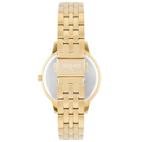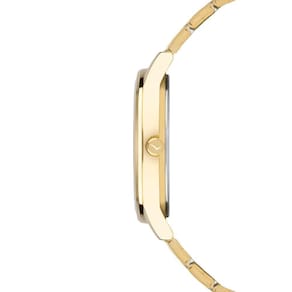 O mostrador dourado minimalista exibe marcadores numéricos e ponteiros em tom dourado, garantindo excelente legibilidade. Com resistência à água de até 50 metros, é ideal para acompanhar a rotina com segurança e estilo.